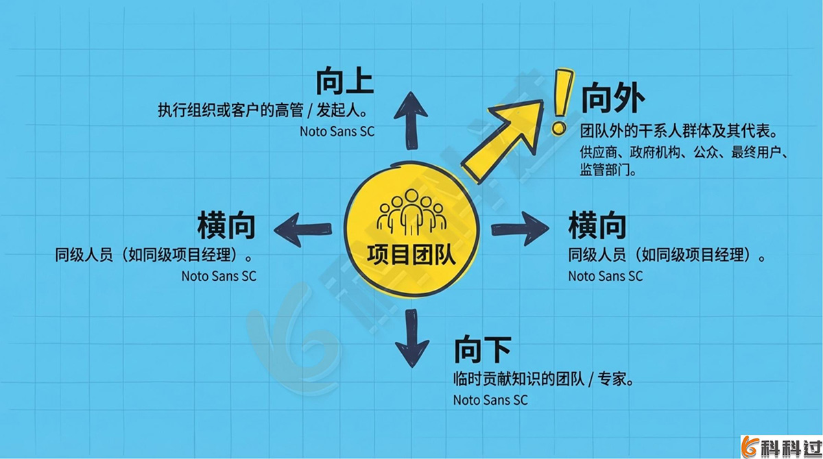 详细解析:根据影响方向分类:“向上”指执行组织或客户组织的高级管理层;“向下”指临时贡献知识的团队或专家;“向外”指项目团队外的干系人群体及其代表,如供应商、政府机构、公众、最终用户和监管部门;“横向”指同级人员。