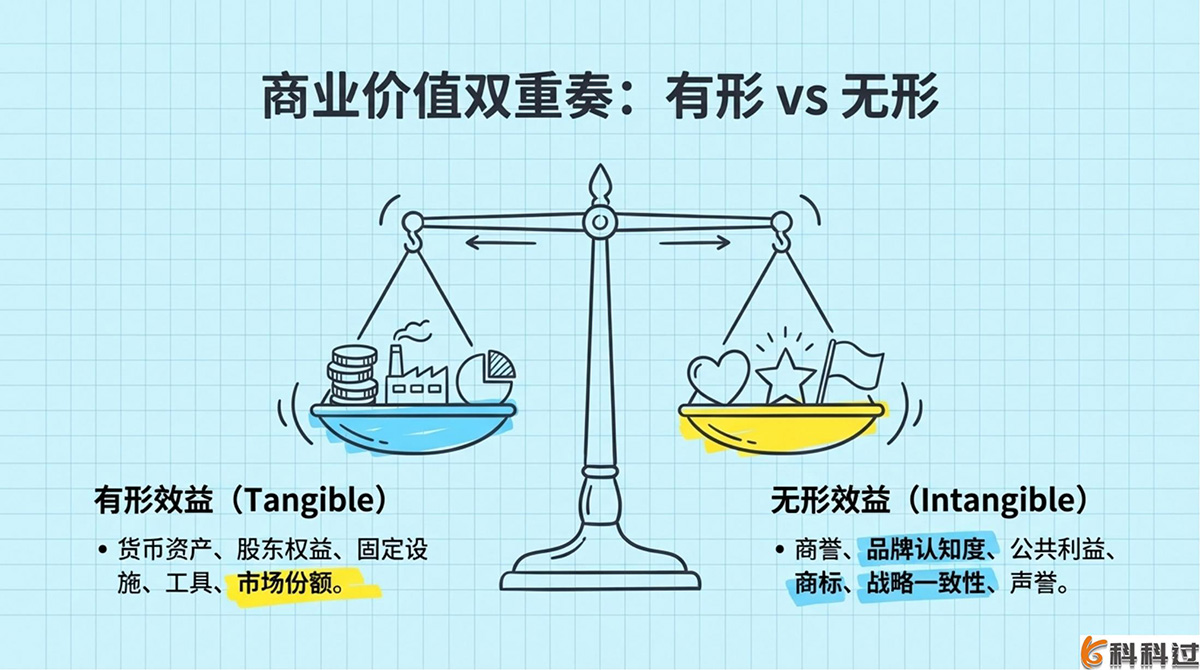 - 商业价值:区分有形(市场份额)和无形(商标、战略一致性)