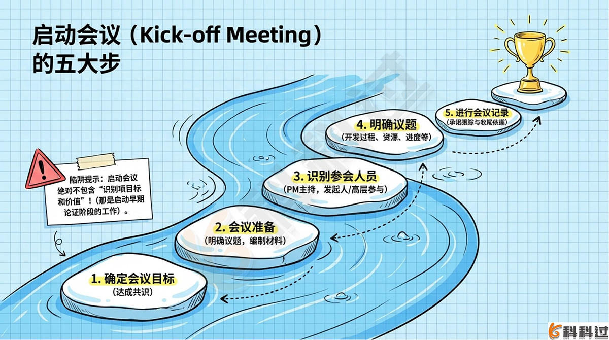 详细解析:项目启动会议的5个工作步骤包括:确定会议目标、会议准备、识别参会人员、明确议题、进行会议记录。不包含“识别项目目标和价值”(这是制定项目章程等启动早期论证阶段或关注价值和目标环节的内容)。