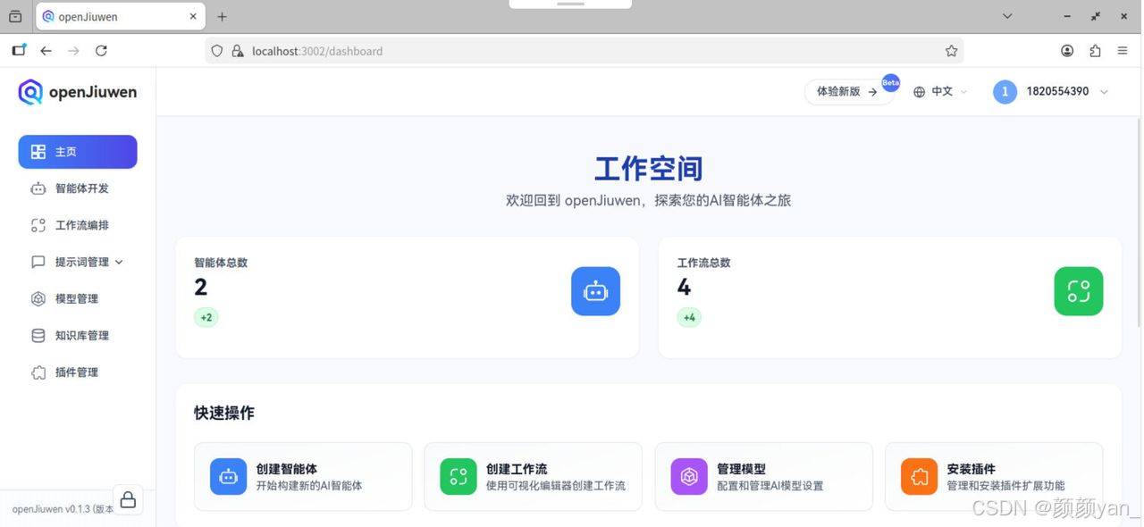 浏览器访问 http://localhost:3002/,若能正常打开工作台,并可进入「智能体管理」和「插件管理」页面,则视为启动成功。