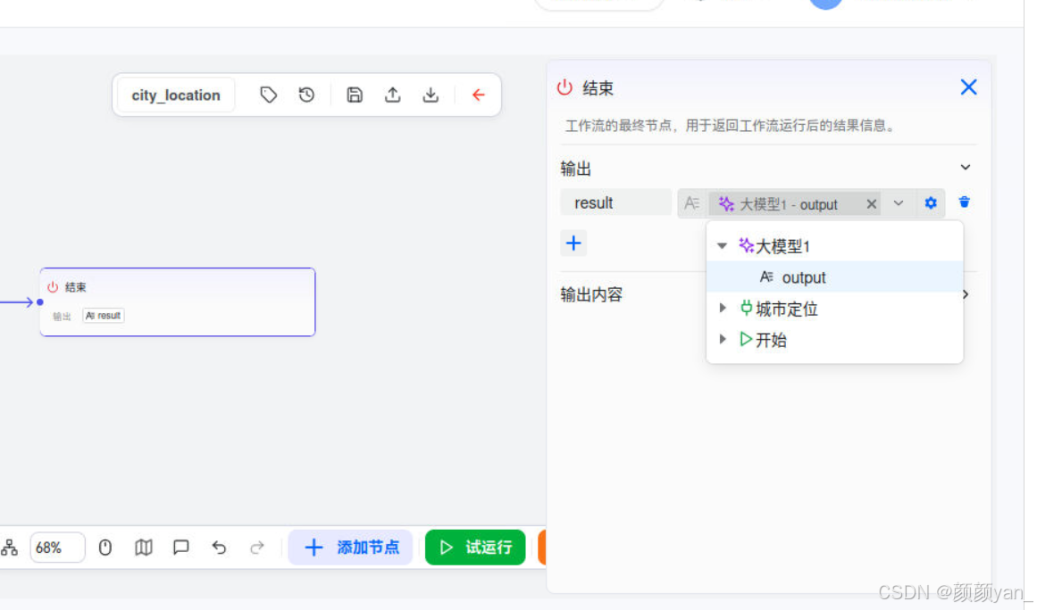 开始节点 → 城市定位插件节点 → 大模型节点 → 结束节点