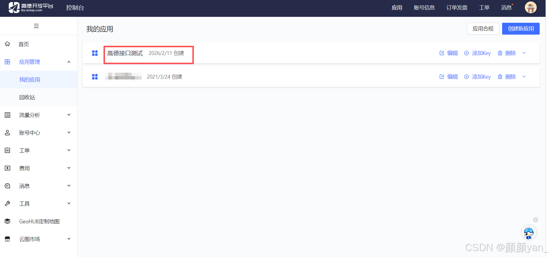 访问高德开放平台,注册账号并创建应用,获取 Key。 注意:Web 服务 API 的 Key 需要绑定安全域名或 IP,本地测试时可先不限制(调试完成后务必设置域名白名单)。