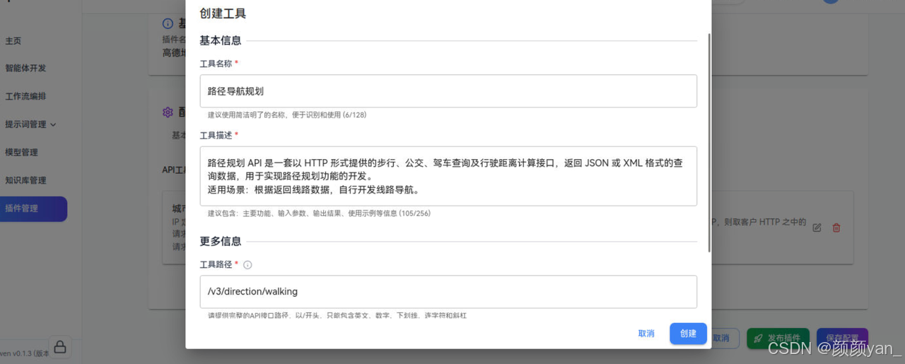 设计思考:将同源 API 聚合为插件,便于权限管理和工作流编排。在创建插件时,服务URL 应填写 API 的基础地址(如 https://restapi.amap.com/v3),后续工具只需配置相对路径。