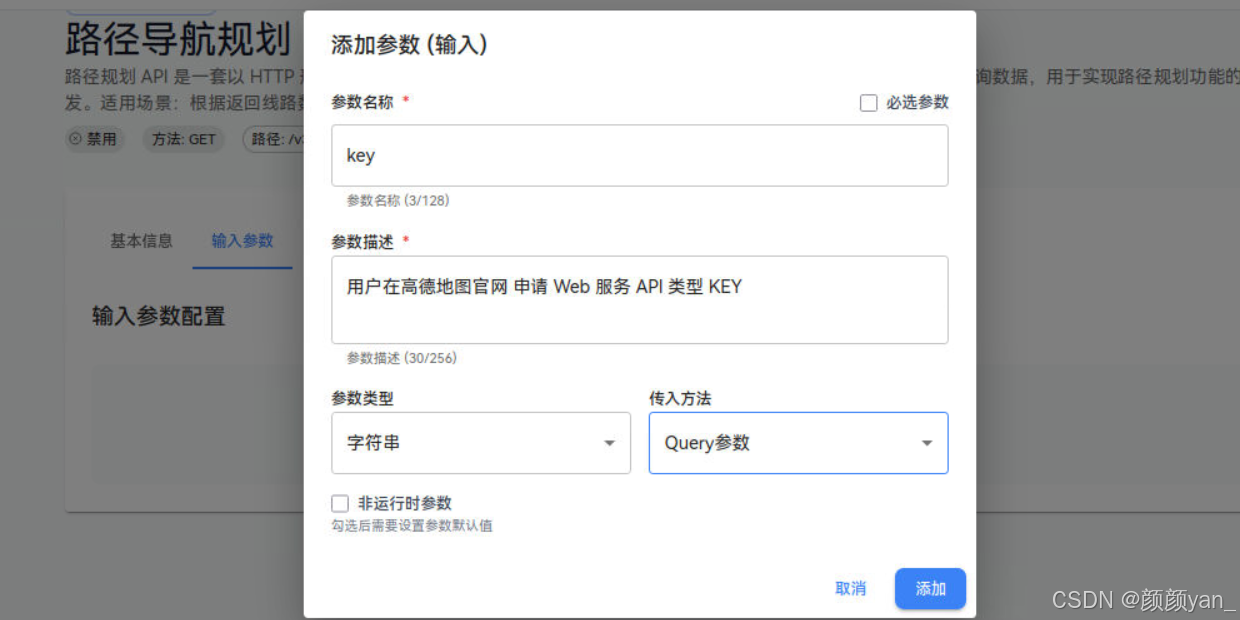 在这个页面,我们可以进一步的完善当前接口API的输入参数和输出参数,以及请求头配置。