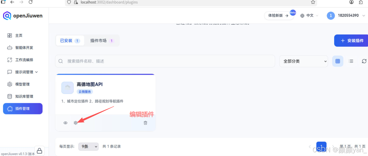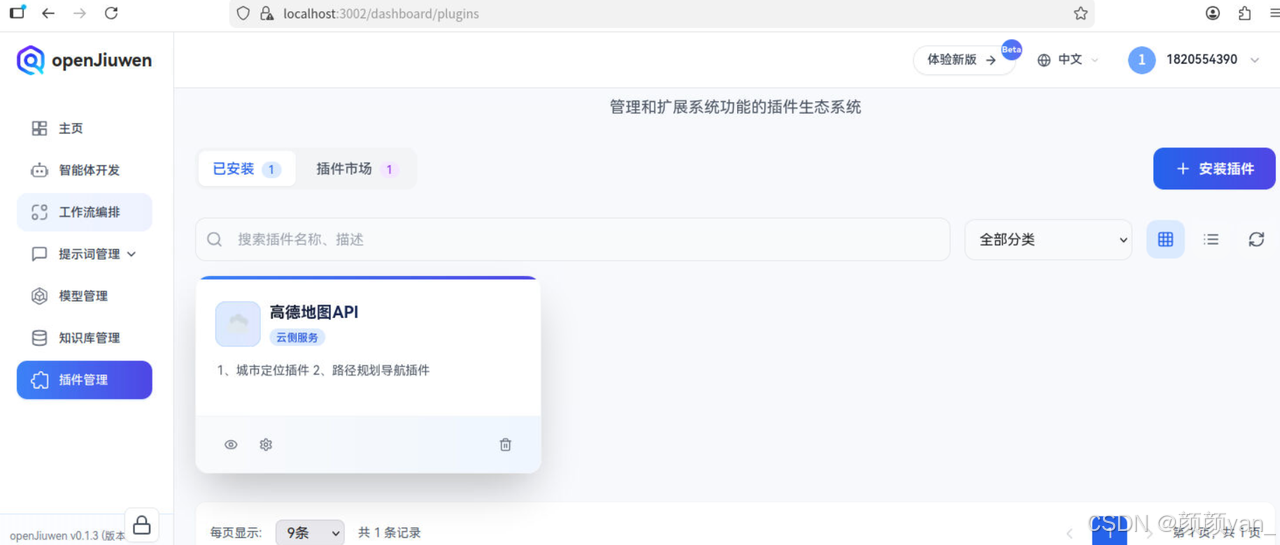 在 openJiuwen 智能体平台中,插件是连接外部能力与智能体工作流的核心桥梁。平台支持本地自定义服务端插件、外部 API 调用插件(云侧插件)及代码插件三种类型。本文将以高德地图 Web 服务 API 为例,完整演示如何通过云侧插件方式接入 IP 城市定位与路径规划两个插件工具,并将其集成到智能工作流中,最终联动大模型完成“城市定位 → 旅游推荐”的自动化任务。