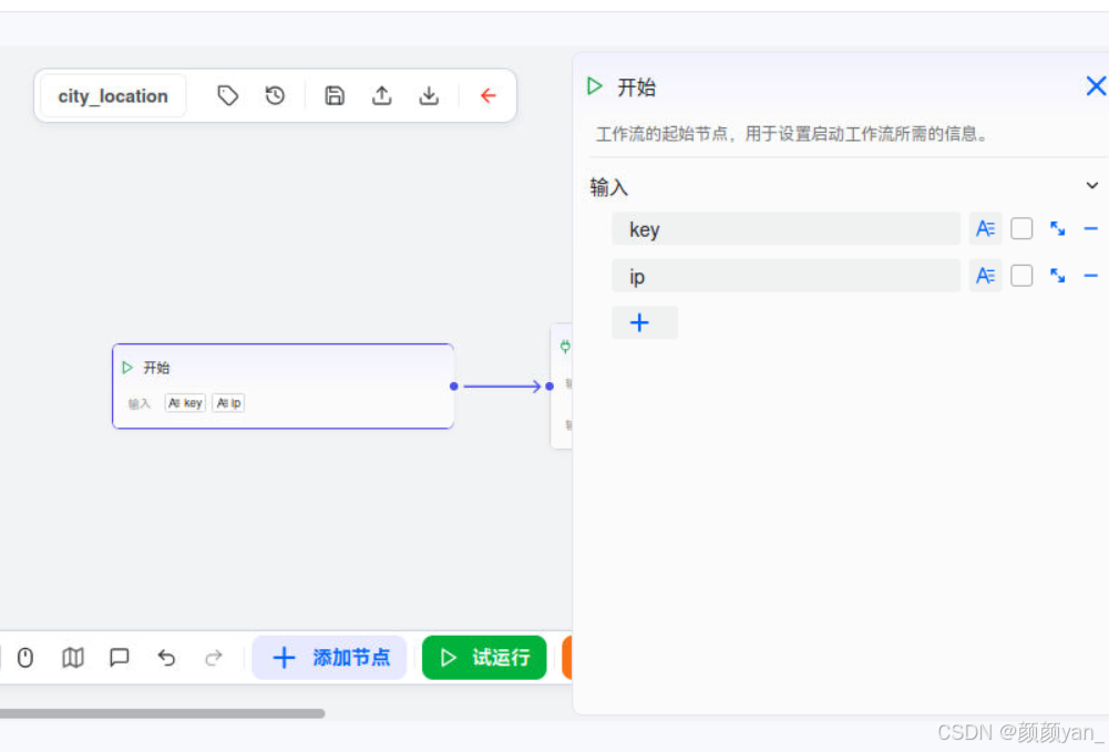 开始节点:添加两个变量 key 和 ip,作为工作流的输入。