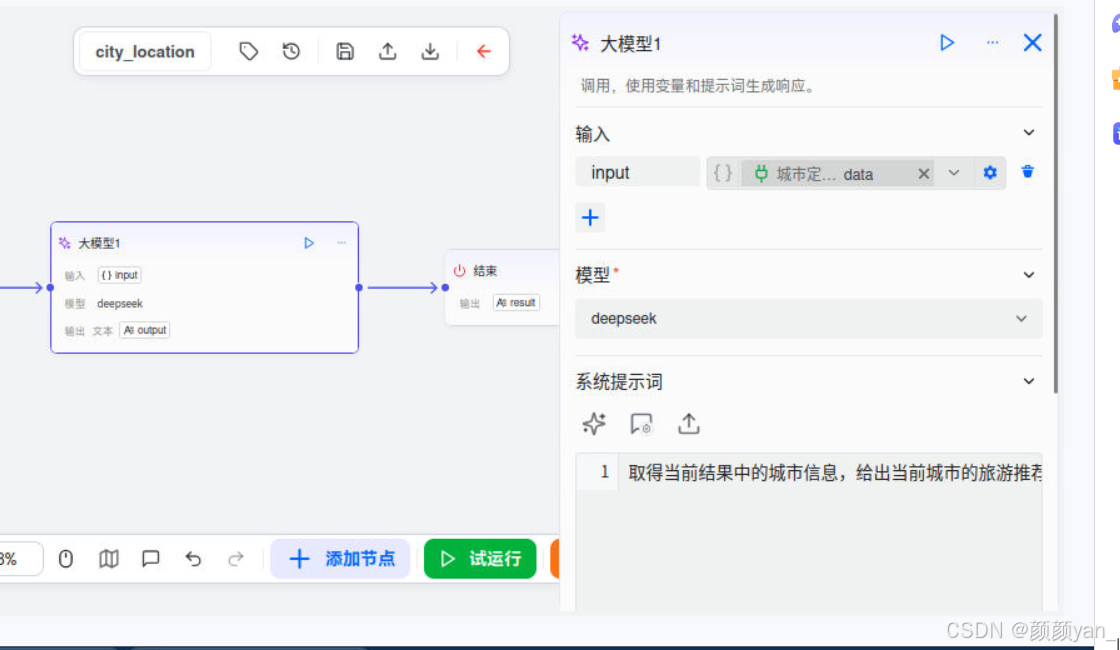 - 提示词设计:”提取当前结果中的城市信息,并给出当前城市的旅游推荐指南“