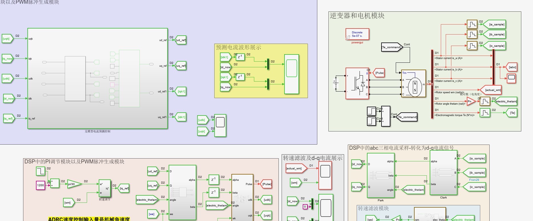 电机控制算法无差电流预测控制顶刊复现 《Model-Free Predictive Current Control of PMSM Drives Based on Extended State Observer Using Ultralocal Model》 基于扩展状态观测器的PMSM驱动器无模型预测电流控制 Yongchang Zhang matlab 建模论文详解(超详细)论文 仿真模型中, 电流环使用论文中的无模型预测控制,转速环使用自抗扰控制(二阶 ESO 和三阶 ESO)与 PI 控制器对比 使用离散化模型,转速的得到使用电机角度进行微分得到,ESO 和电压指令大多数模块都是使用函数,使用自抗扰控制参数整定。