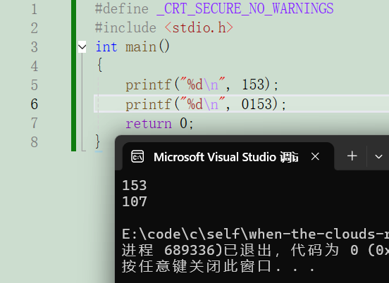 8进制的数字每⼀位是0~7的,0~7的数字,各⾃写成2进制,最多有3个2进制位就⾜够了,⽐如7的2进制是111,所以在2进制转8进制数的时候,从2进制序列中右边低位开始向左每3个2进制位会换算⼀个8进制位,剩余不够3个2进制位的直接换算。比如:2进制的01101011,换成8进制:0153,0开头的数字,会被当做8进制