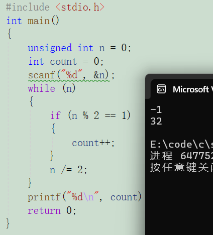 我们这里也是可以直接改进一下,可以将n定义为无符号整型 unsigned int,-1的补码是32个1,符号位的1对于无符号整型n来说,已经不是符号位,n认为是无符号数,是一个非常大的整数。