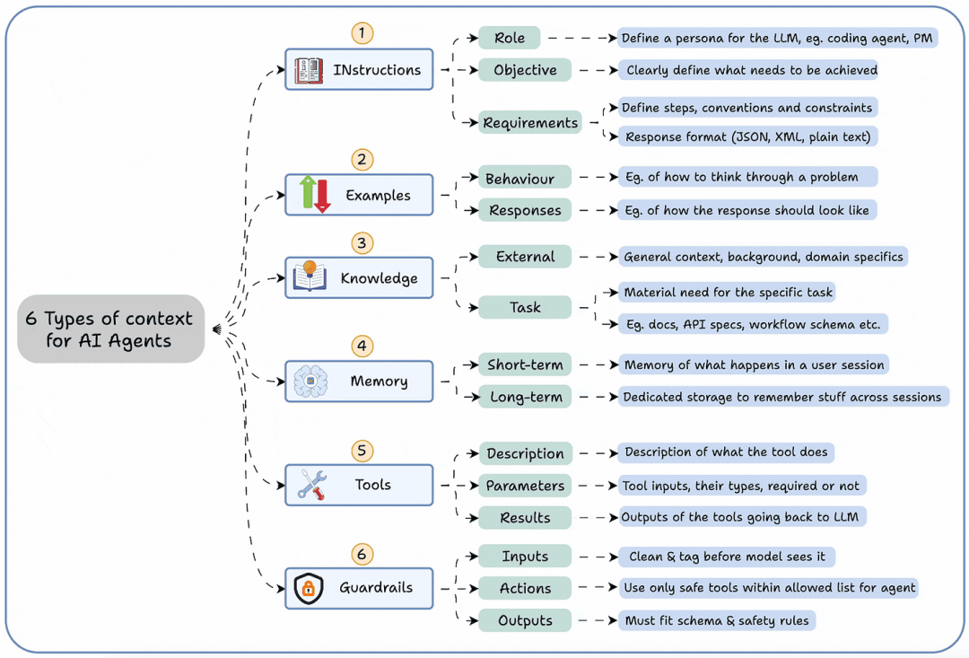下面的图表总结了一个智能体正常运作所需的六种上下文类型,这些类型共同构成了智能体理解和执行任务的基础:
