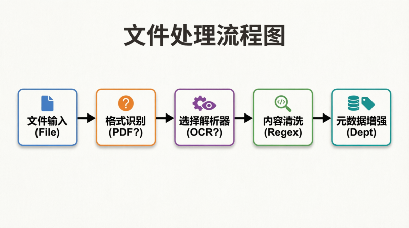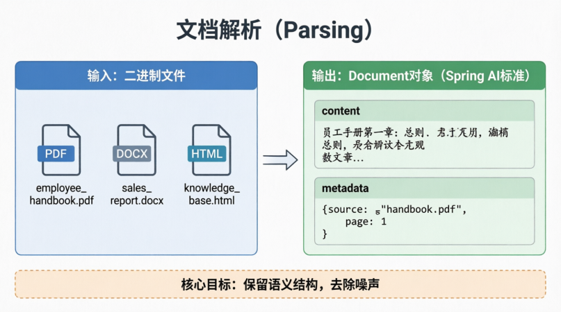 将非结构化或半结构化的原始文件(PDF, Word, HTML 等),转换为 RAG 系统可处理的 纯文本 (Text) + 元数据 (Metadata) 的过程。
