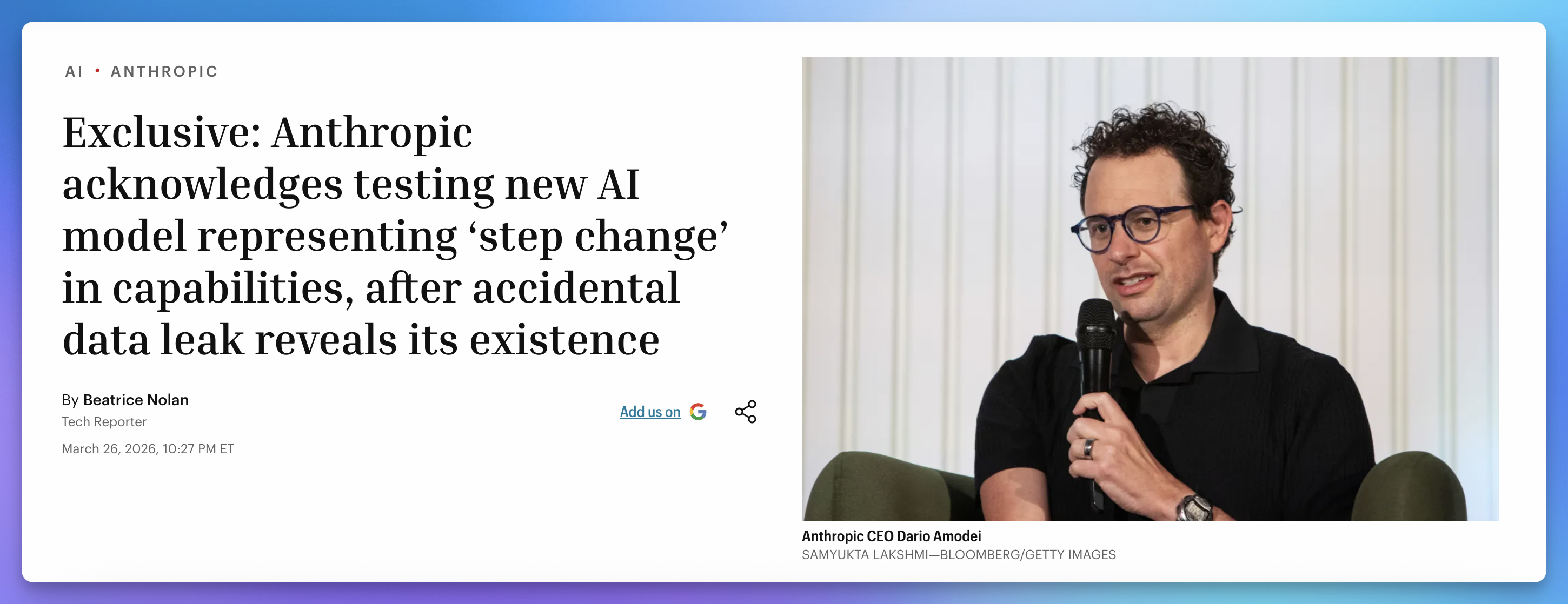 3 月 26 日 Fortune 独家报道,LayerX Security 的 Roy Paz 和剑桥大学的 Alexandre Pauwels 在 Anthropic 博客后台发现了一个未设防的数据库,近 3000 份未发布文件挂在公网上。其中一篇已排版完毕的草稿揭示了从未公开的第四档模型层级「Capybara」(水豚),正式名 Claude Mythos,定位在 Opus 之上。Anthropic 发言人确认了模型存在,称其为「阶跃式变化」和「迄今构建的最强模型」,将泄露归因于内容管理系统的「人为配置错误」。