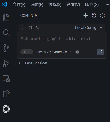 启动 VS Code,打开 Continue 侧边栏(左侧面板对应图标);