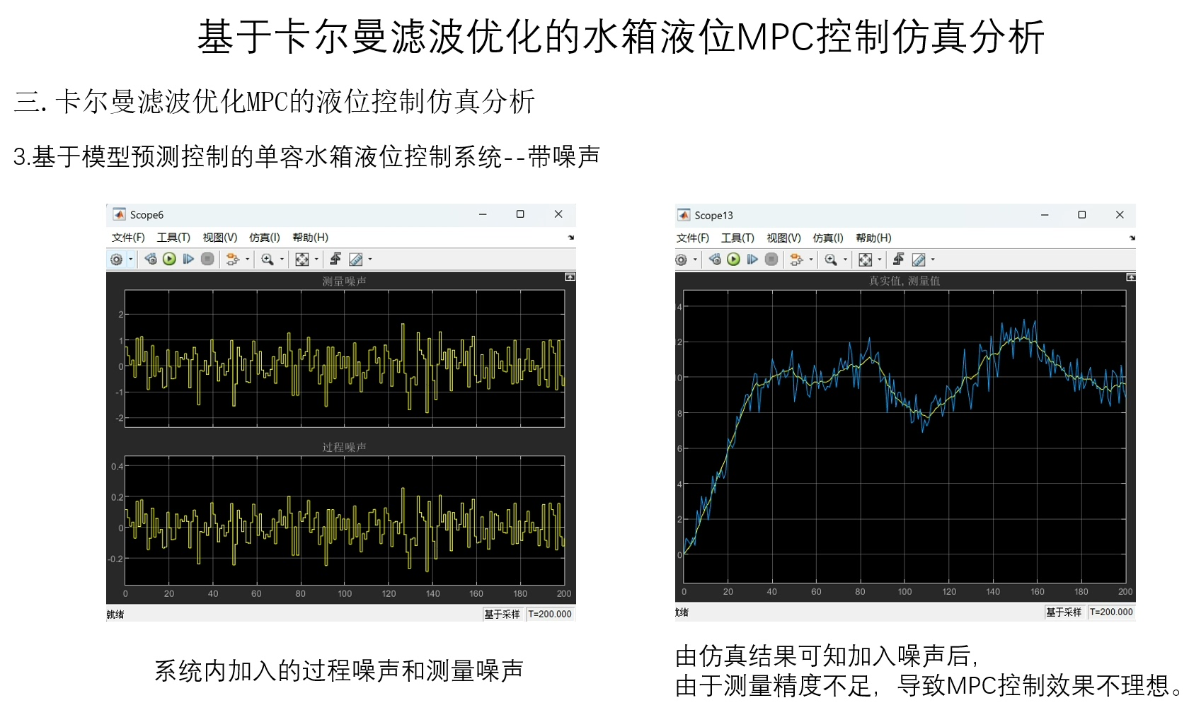 通过Matlab/Simulink搭建单纯MPC控制和基于卡尔曼滤波优化的MPC控制单容水箱液位的仿真模型。从仿真结果可以明显看出,基于卡尔曼滤波优化的MPC控制,液位能够更快速、稳定地跟踪设定值,在面对噪声干扰时,波动更小。