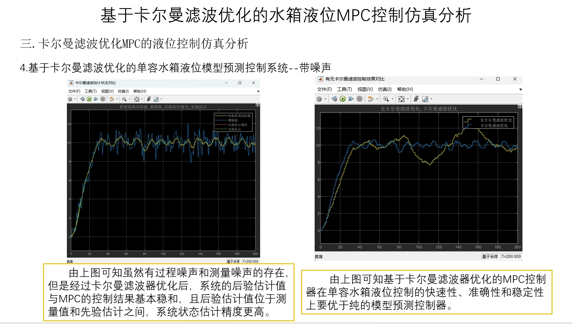 综上所述,基于卡尔曼滤波优化的单容水箱液位MPC控制确实展现出了更好的性能。如果大家对这方面感兴趣,可以进一步研究相关的8册论文、3册图书,以及我自制的43页PPT和模型,相信会有更多收获。