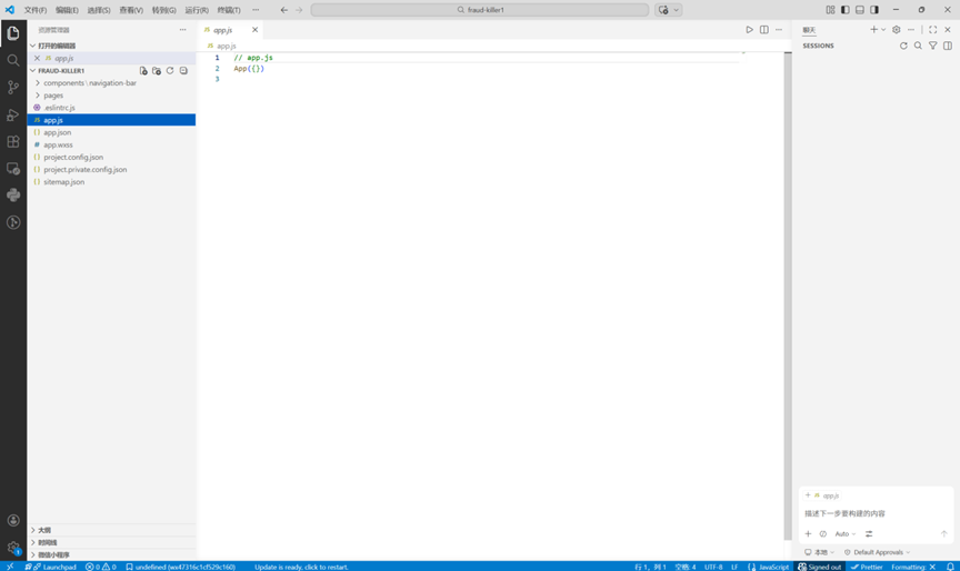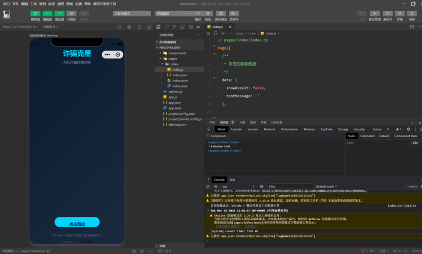 先在微信开发者工具中进行新建项目。名称为“fraud-killer”,路径任意,这里放在D盘Git文件夹下方便统一管理。开发模式选择“小程序”,后端服务选择“不使用云服务”,选择模板可以选择“不使用”或者根据自己喜欢挑选一个合适的模板都可以。确认后即可自动生成初始项目结构。