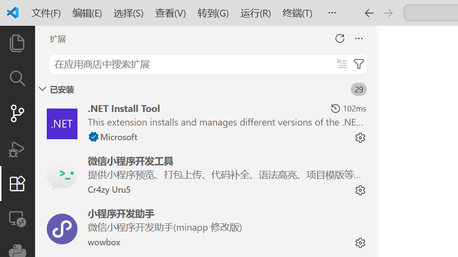 打开Visual Studio Code编辑器,打开相对应的文件夹,即可出现需要编写的项目结构。在编辑之前先要安装需要的插件。打开插件市场,搜索并安装:微信小程序开发工具(小程序开发的官方运行环境与调试基座,这个必须安装)、小程序开发助手(WXML/JS 智能提示与编码增强插件,辅助开发)、Miniprogram(VS Code 与微信开发者工具联动的桥梁 + 基础编码增强)等简化开发的插件。