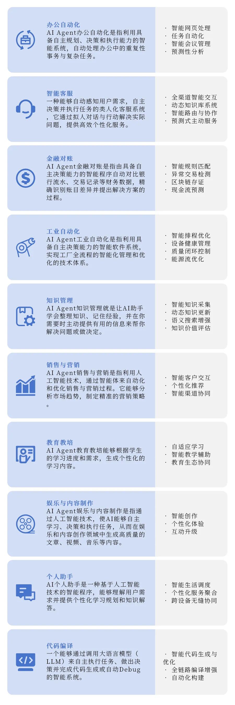 AI大模型与Agent结合,形成“大脑+手脚”的智能系统,广泛应用于智能客服、自动驾驶、虚拟助手、代码生成、企业决策等场景。