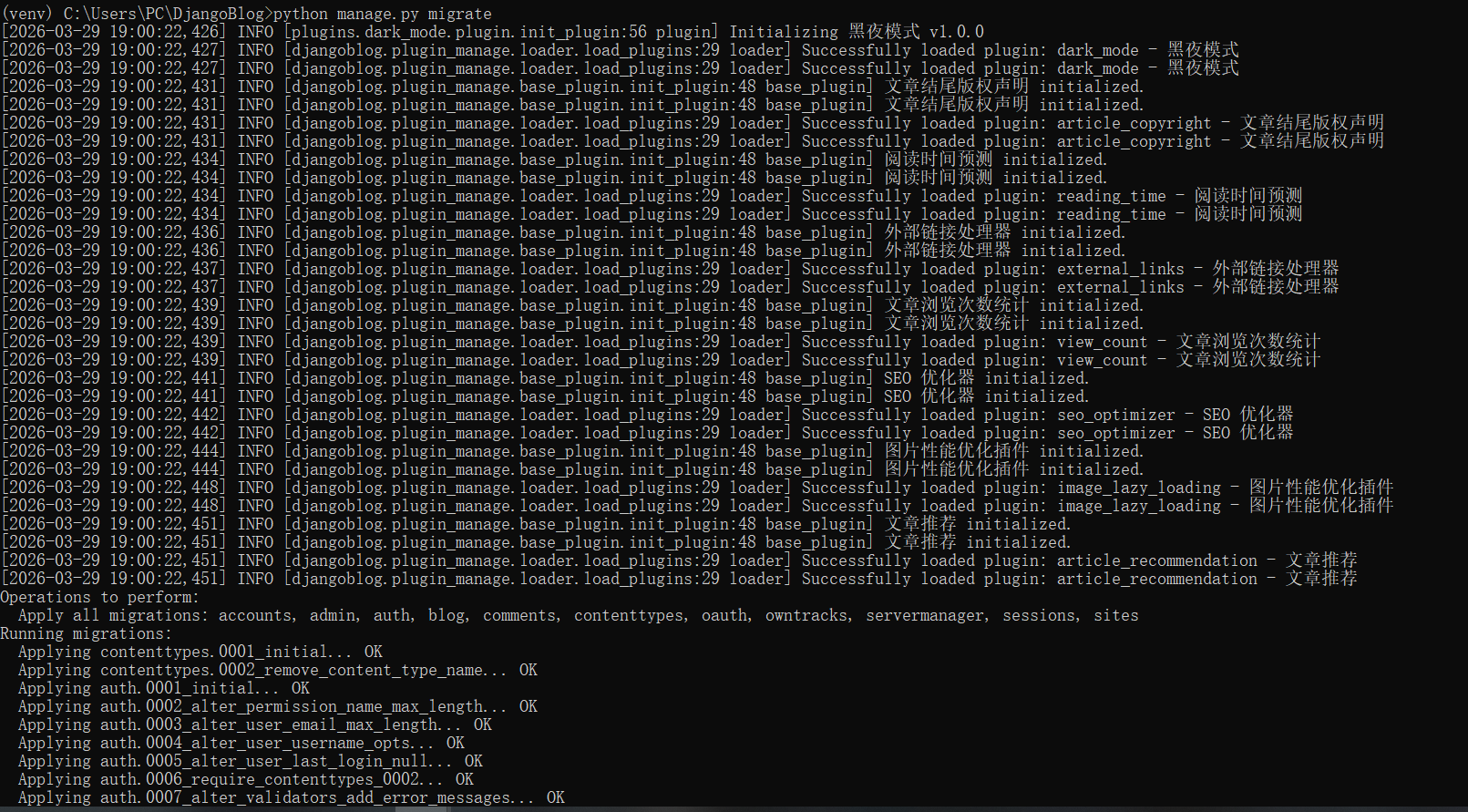 插件系统:核心特色模块,通过在 View 层预定义钩子函数,让插件可以在不修改核心 MVT 代码的前提下,扩展业务逻辑(如view_count插件在文章视图中触发浏览计数更新);