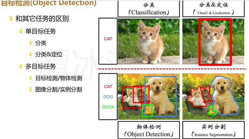- Anchor Free检测算法:不产生Anchor Box候选框,直接对图像进行前向过程,直接输出边框位置以及坐标,代表算法:YOLOv1、CornerNet等