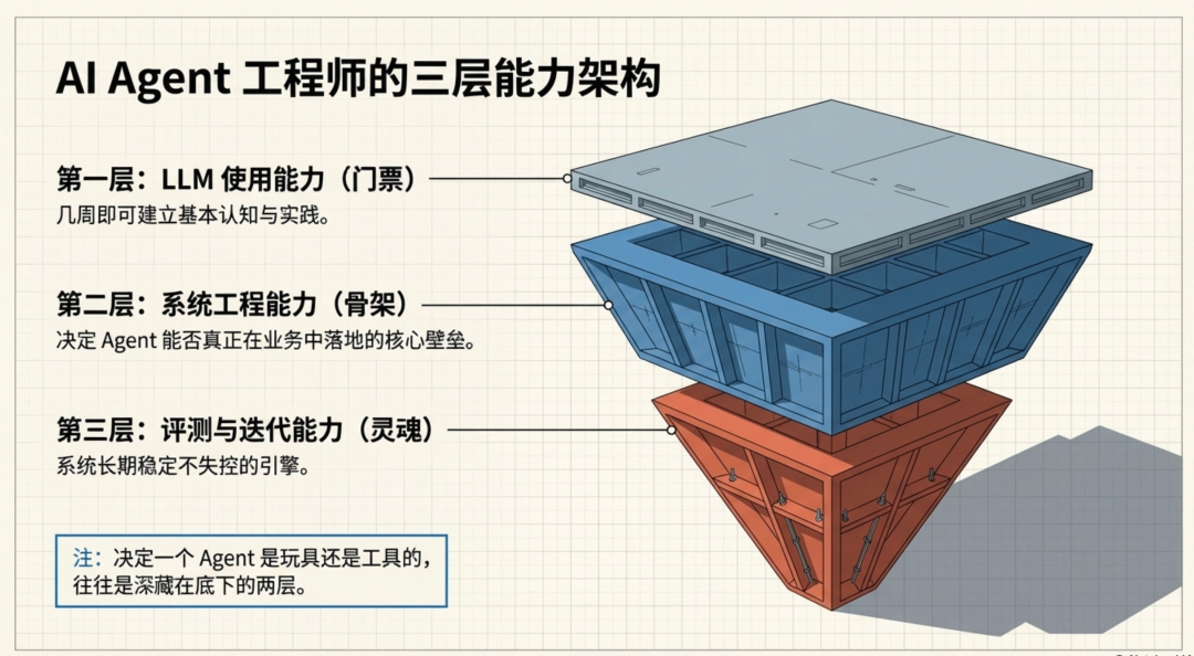 如果拆开来看,我觉得 AI Agent 工程师的能力结构,大致可以分成三层。