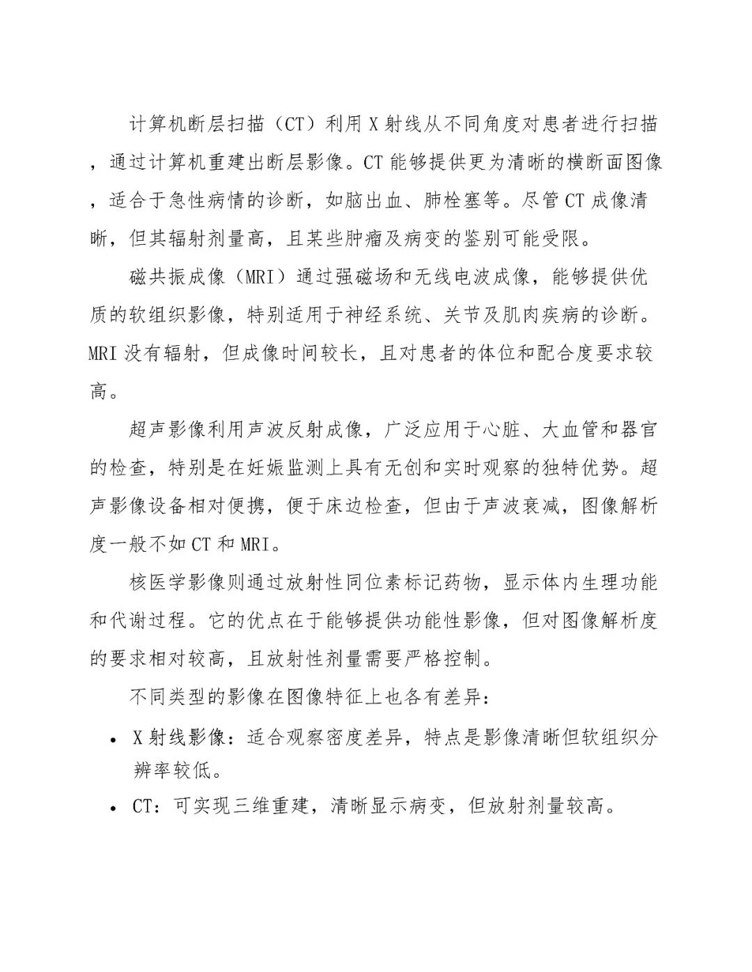 超声:实时、安全、便携,广泛应用于妇产科和心血管领域。