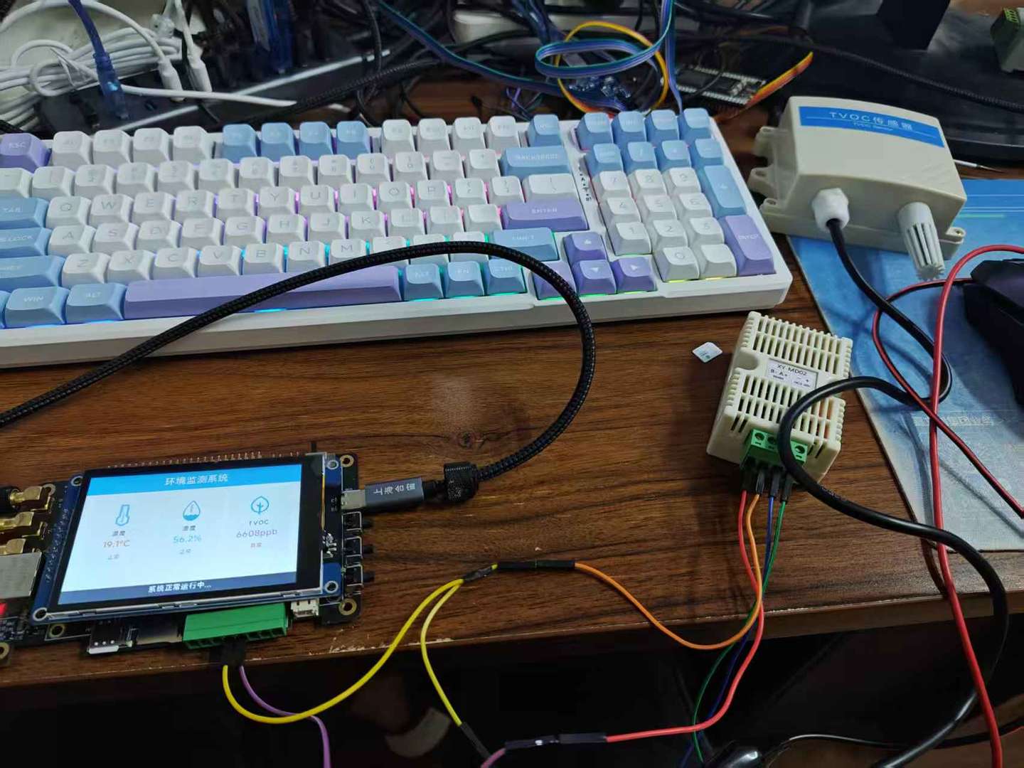 硬件方面:使用 Air8000A 多路 RS485 接口连接温湿度、TVOC 传感器,通过 GPIO 实现 485 总线供电控制。
