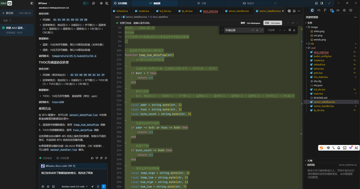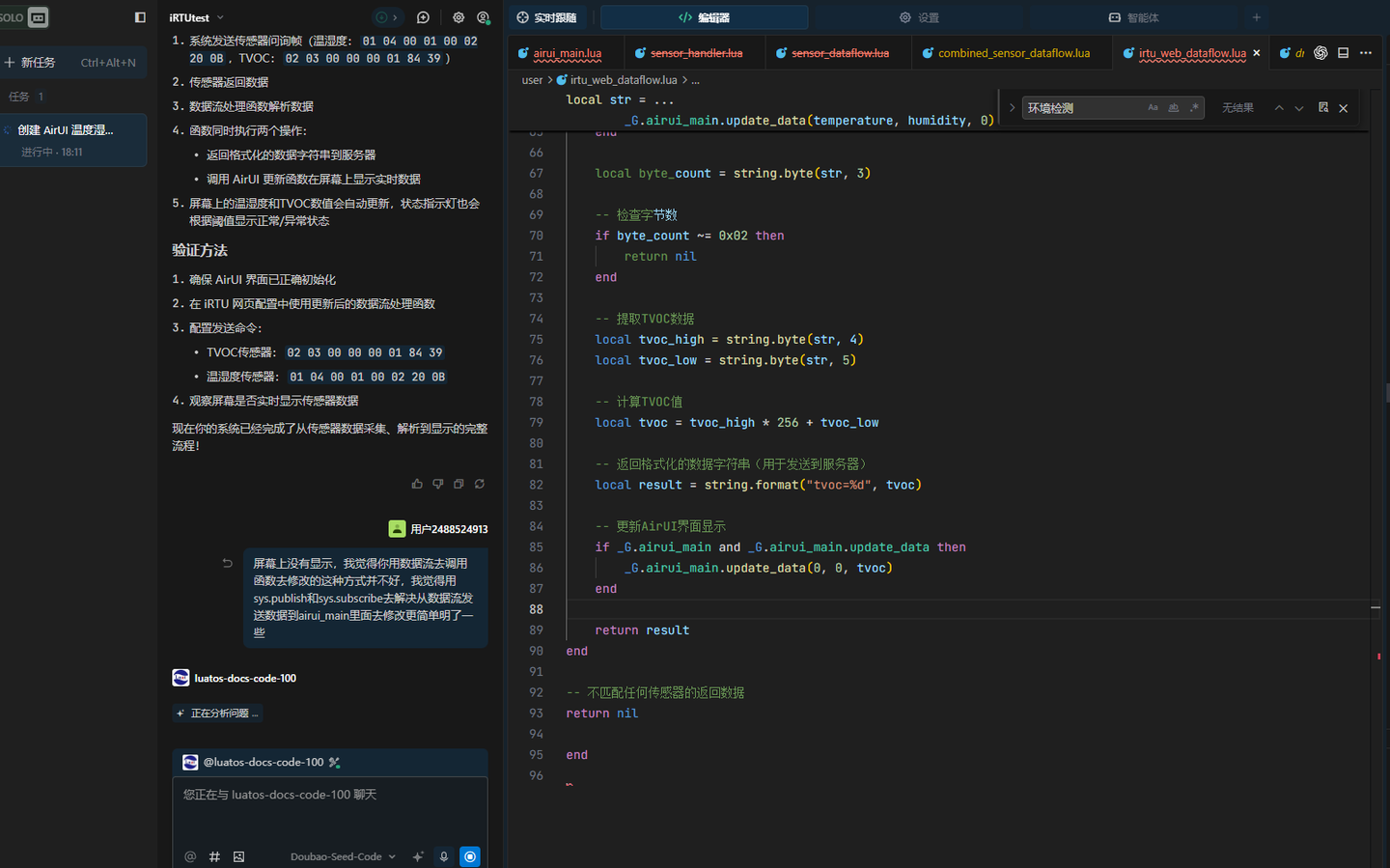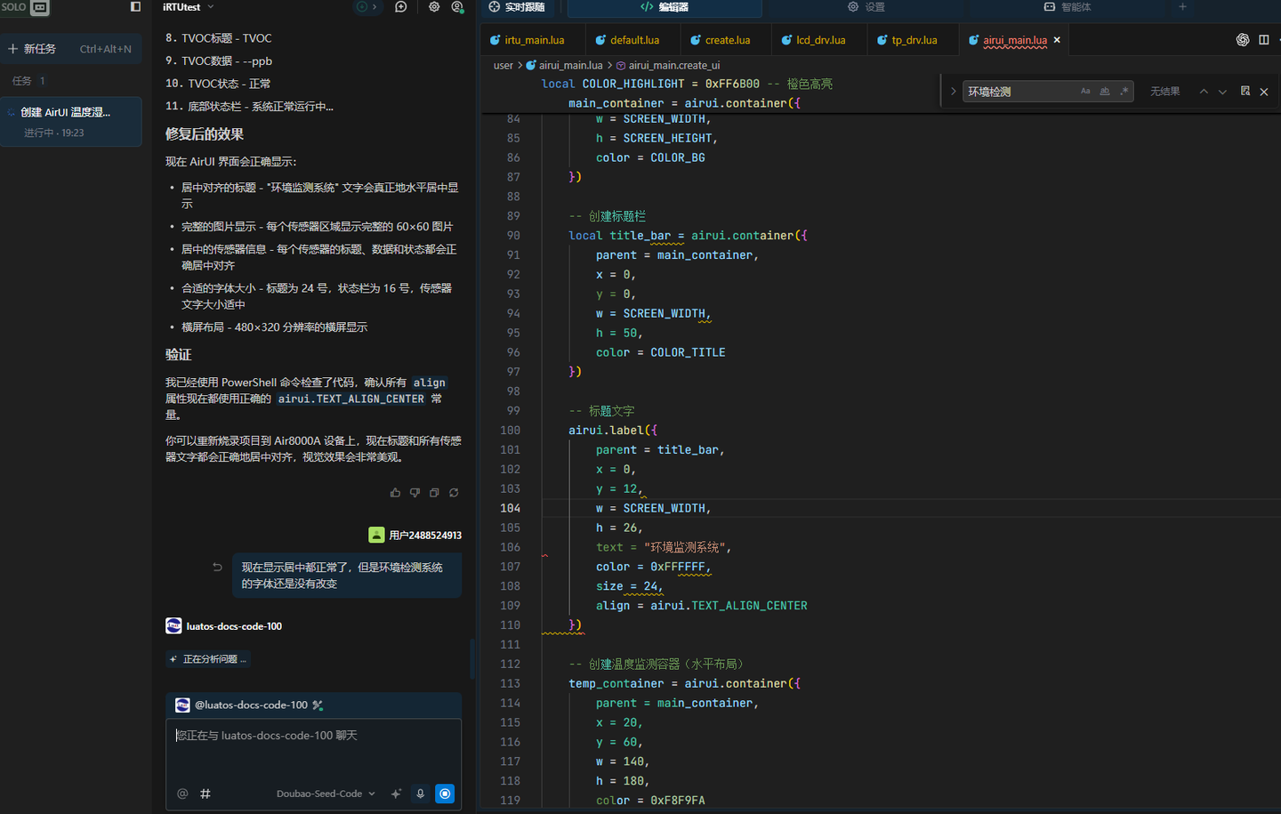 本文基于 Air8000A 工业引擎,结合 AirUI 嵌入式 UI 框架与 iRTU 工业通信中间件,在 AI 智能体(luatos-docs-code-100)支持下,完成一套 RS485 工业环境参数监测系统。
