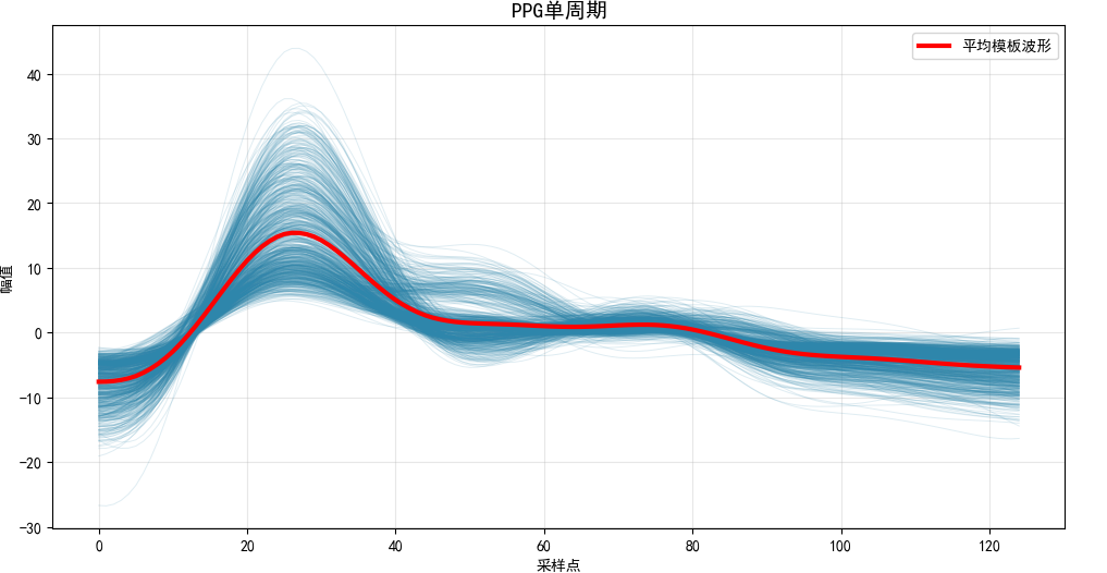 本文基于PulseDB数据库[10]中三个受试者,该数据库是基于MIMIC-III和VitalDB的大型清理数据集,用于为无袖血压估计方法制定基准。实验中首先从 MIMIC-III 数据库中选取 3 名受试者的 PPG 信号数据,对应文件为p000001.mat、p000003.mat与p000005.mat,其中将p000001.mat与p000005.mat划分为源域数据集,p000003.mat划分为目标域数据集。其次,对 3 名受试者的 PPG 信号进行单周期提取(提取流程如图 3 所示),最终源域数据集共得到维度为 (1679, 125) 的 PPG 信号样本,以及对应维度为 (1679, 2) 的血压标签;目标域数据集得到维度为 (492, 125) 的 PPG 信号样本,对应标签维度为 (492, 2)。最后,将预处理完成的数据集输入所构建的网络模型,对目标域 PPG 信号对应的血压值进行预测,并计算相关评价指标以评估模型性能。