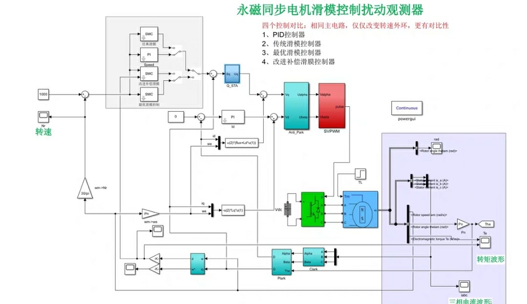 (67)基于滑膜控制扰动观测器的永磁同步电机PMSM模型 四个控制对比: 1、PID控制器 2、传统滑模控制器 3、最优滑模控制器 4、改进补偿滑膜控制器 [1]附带简单讲解视频 如下图 [2]附带出图四个控制对比的说明文档