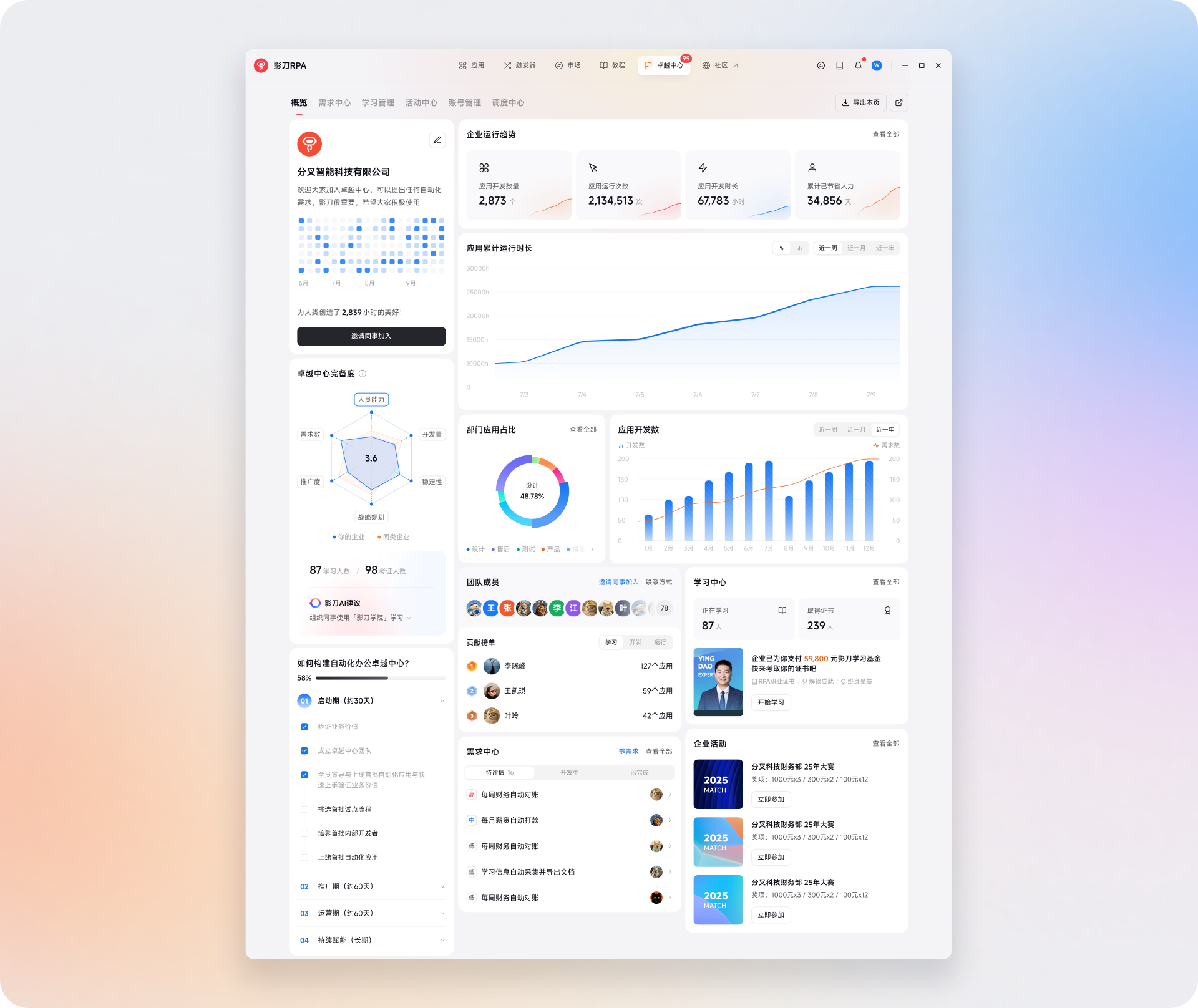 影刀 RPA 6.0 的「卓越中心」,正是为此而生。它为企业构建了一个完整的自动化闭环管理平台,将学习、需求、开发、运行、运营与汇报,统一纳入同一套体系之中。自动化不再是零散的项目,而成为一项可以被沉淀、被复用、被持续优化的组织能力。