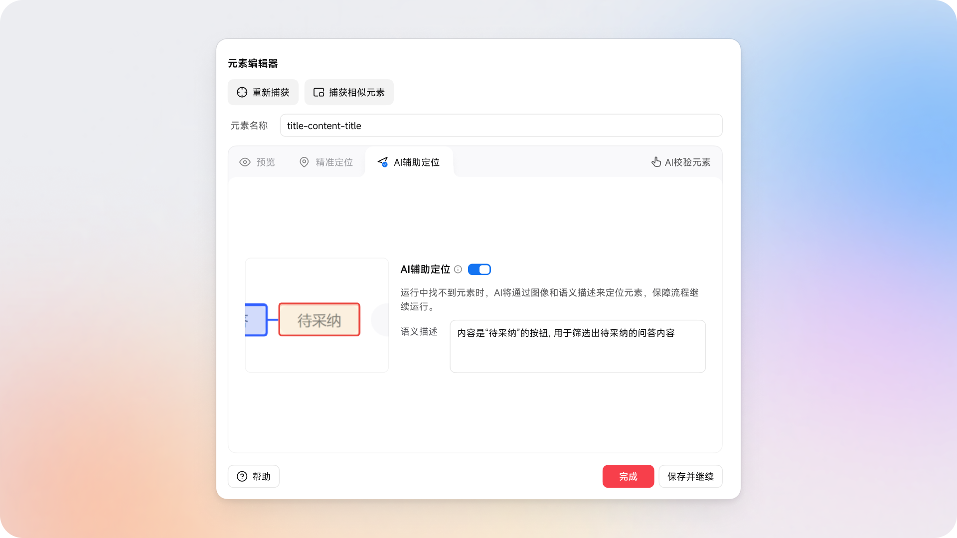 现在,你可以使用 「AI 辅助定位」。在捕获元素后,开启该功能,AI 会基于你的操作目标,生成一段语义描述——比如:「订单的发货按钮」。当网页发生变化时,只要这个按钮依然存在,AI 就会结合语义理解与页面图像,重新定位它的位置。不再只依赖结构,而是理解“意义”。
