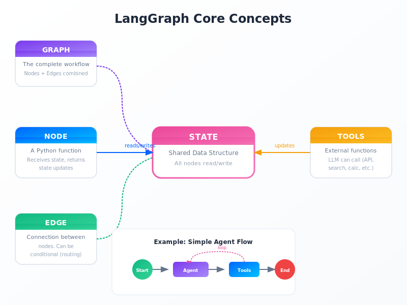 ·节点(Node):执行具体任务的函数。比如"调用LLM"、“执行工具”、“处理数据”