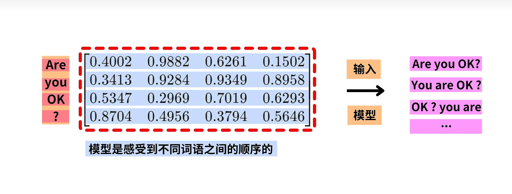 模型感受不到不同词语之间的顺序的,所以可能会被理解成 ok?you are等。所以positional encoding 才显得有他的重要之处。