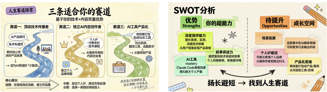 它甚至帮我分析了优势和劣势,给了三条人生赛道建议,还自动生成了四张手绘风格的信息图。