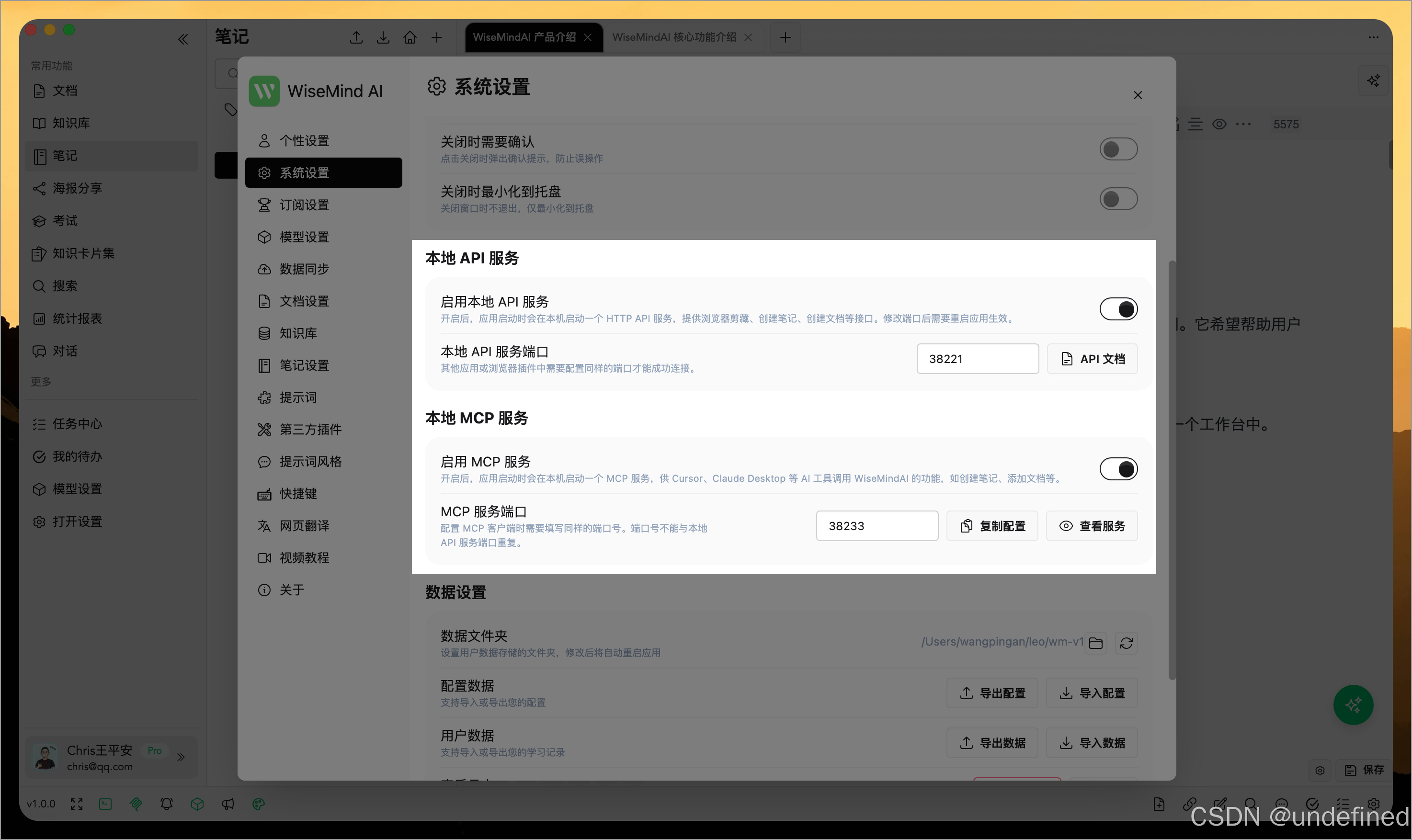 本地 API 服务和本地 MCP 服务:让其他 AI 工具可以随时调用 WiseMindAI 核心功能。