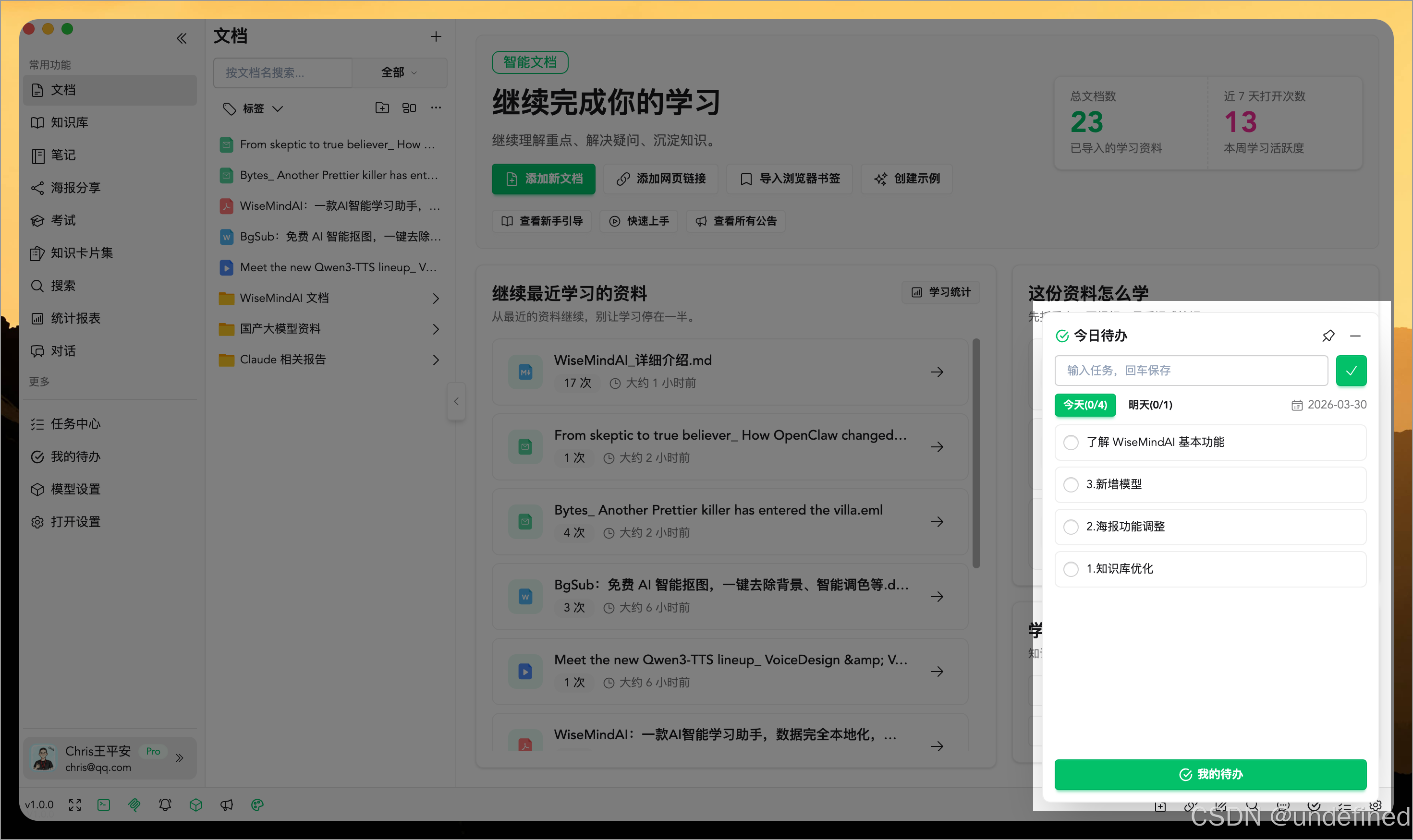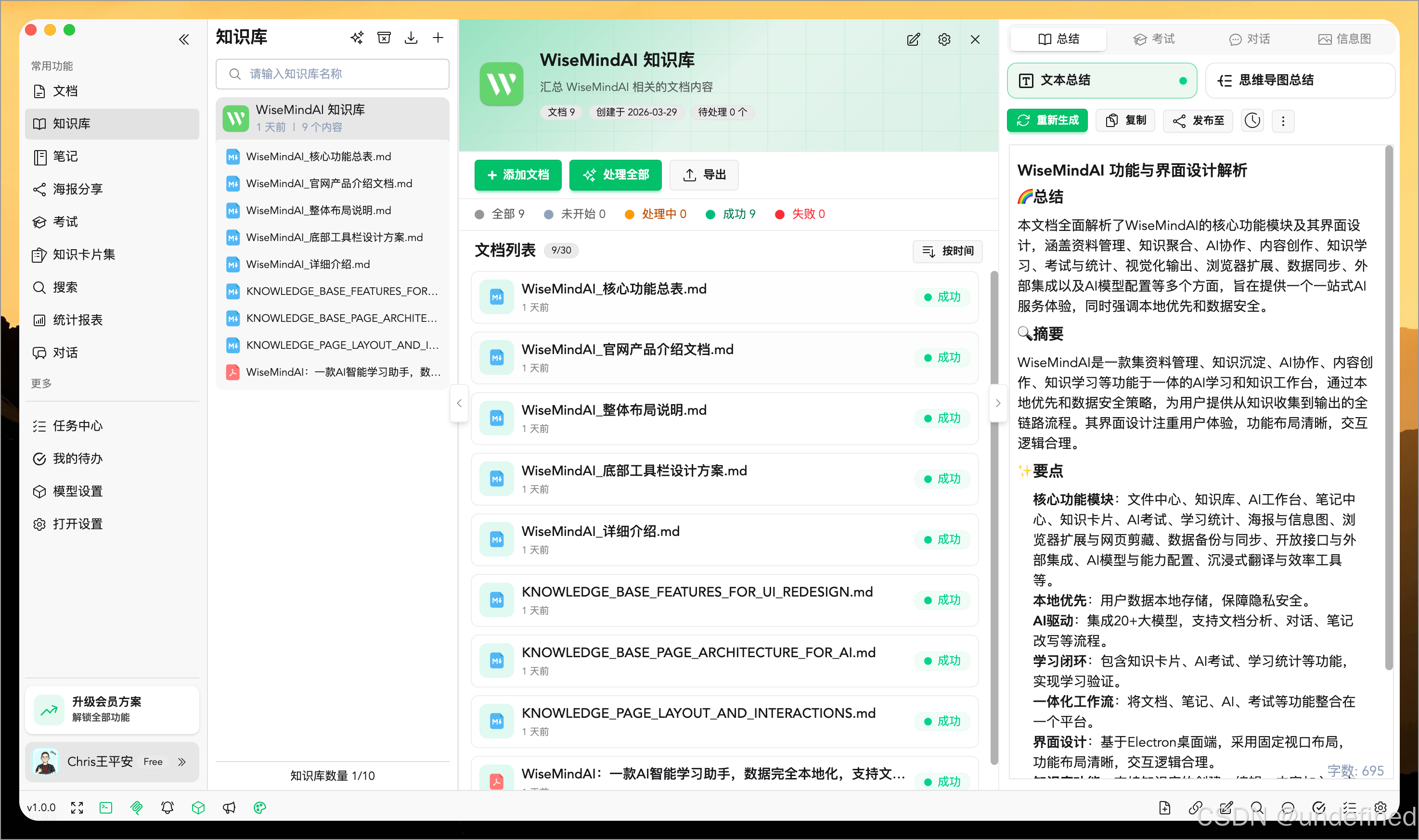 WiseMindAI 是一款本地优先的 AI 学习与知识工作台。将文档中心、知识库、AI 工作台、笔记中心、知识卡片、AI 考试、学习统计、海报与信息图等模块放进同一套工作流里,让资料处理、知识沉淀和成果输出都在一个地方完成。