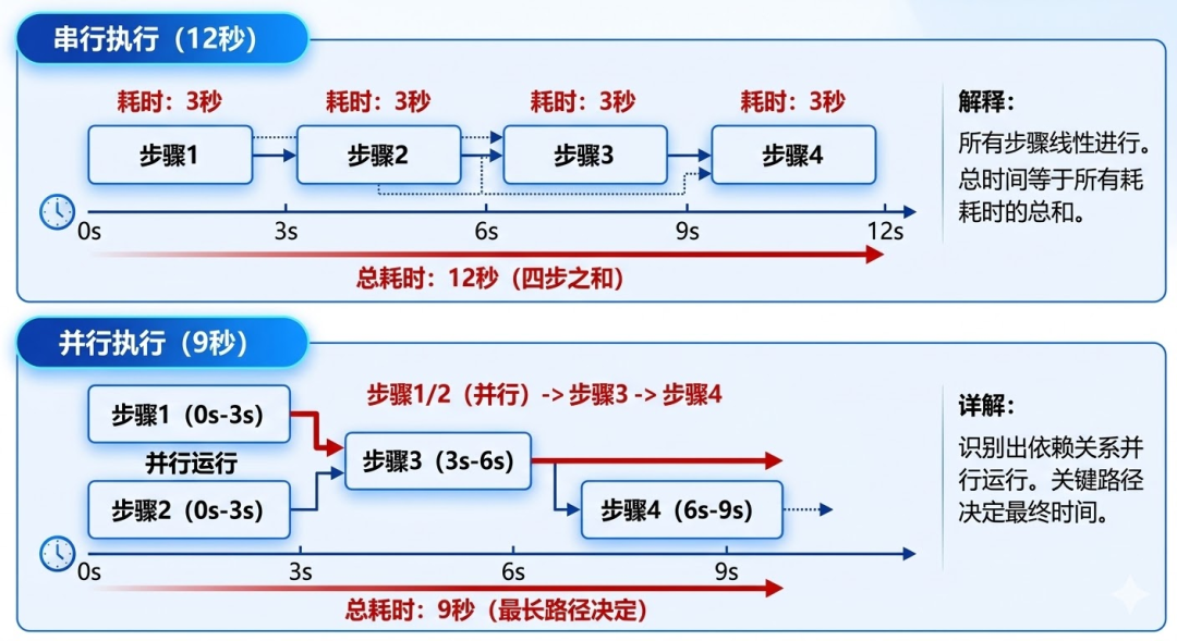 如果这四步全部串行,总时间是四步之和。识别出依赖关系并行执行后,关键路径变成「步骤1/2(并行)-> 步骤3 -> 步骤4」,假设每步各需要 3 秒,串行是 12 秒,并行之后是 9 秒。