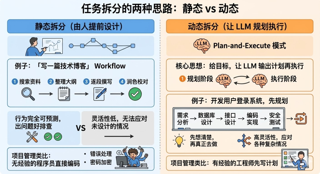 拆分方式主要有两种:一种是静态拆分,提前把步骤写死;另一种是动态拆分,让 LLM 自己根据目标规划步骤,更灵活但也更难控制。