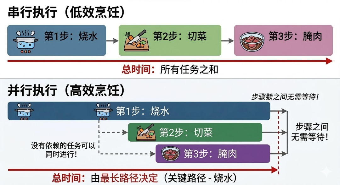 总时间由「最长的那条路径」决定,也就是烧水的时间,因为切菜和腌肉都在等水开的过程中完成了。并行执行降低的不是「每步的时间」,而是「关键路径的总时间」。