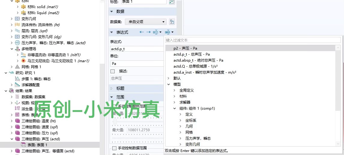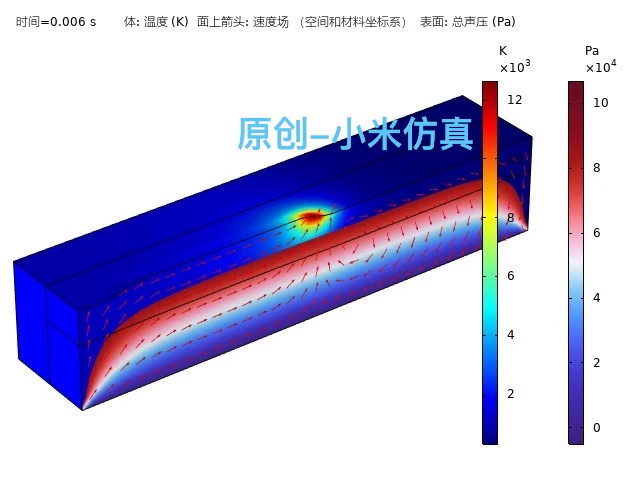 小经验:一开始我设了50kHz,结果声能在熔池表面衰减太快,传不到内部;降到25kHz后,声压分布能覆盖整个熔池深度,环流效果直接拉满。而且先预计算声场再耦合,比实时计算省了至少30%的算力。