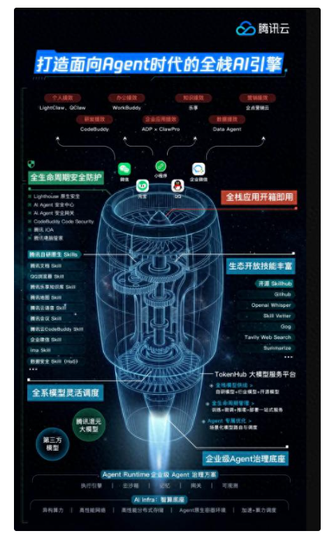 而云端虾、QQ 端 OpenClaw 作为支撑,分别提供低成本算力和轻量协同能力,形成了从核心办公到轻量协作的全场景企业 AI 服务矩阵。