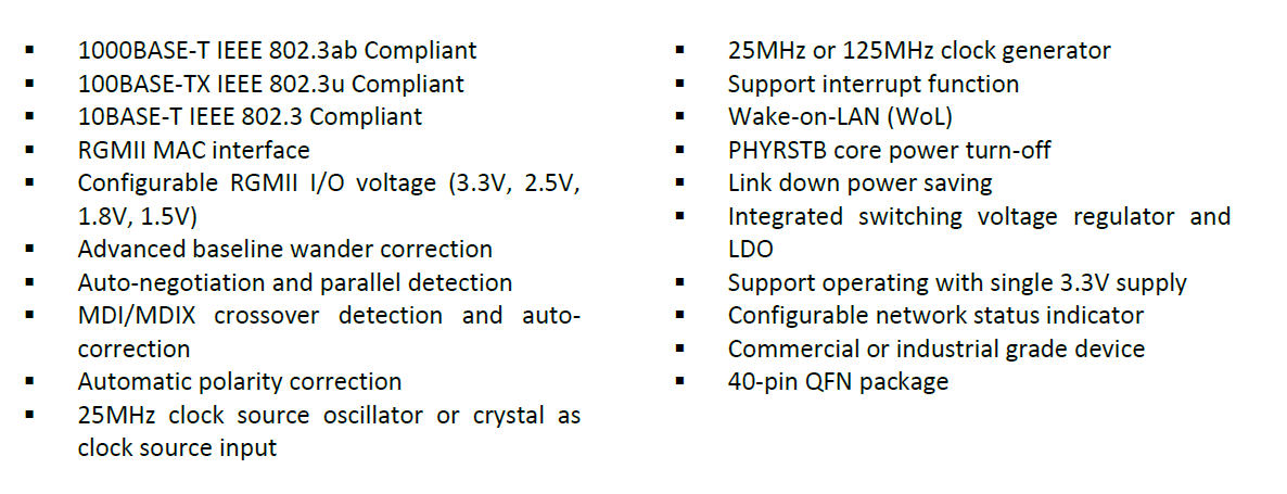 以目前主流国产千兆PHY 联芸MAE0621A-Q3C芯片为例,芯片还支持速率协商(10M/100M/1000M)、双工模式匹配、网络唤醒等功能: