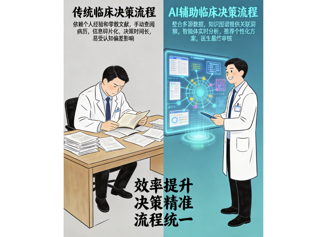 同时,医学知识呈现高度碎片化。疾病机制、治疗方案、患者预后等信息分散在各种专业期刊、临床指南、会议摘要和病例报告中,缺乏系统化整合。在复杂患者案例面前,尤其是多病共存、罕见病或个体化治疗决策场景下,医生需要耗费大量时间检索、比对、综合多源信息,决策过程漫长且易受认知偏差影响。