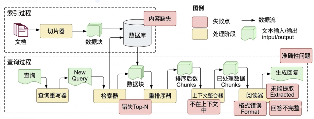| 1. 内容缺失 (Missing Content) | 知识库中不存在回答问题所需的知识。 | 1. 增加知识库:将相关文本加入向量库。 2. 数据清洗与增强:提高输入数据质量。 3. 优化 Prompt:引导模型在无答案时回答“无法回答”,防止胡乱回答。 |