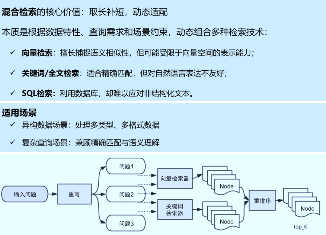检索阶段的目标是确定最相关的上下文。通常,检索基于向量搜索,它计算查询与索引数据之间的语义相似性。因此,大多数检索优化技术都围绕嵌入模型展开,比如微调嵌入模型,将嵌入模型定制为特定领域的上下文,特别是对于术语不断演化或罕见的领域。还有其他检索技术,例如:混合搜索,通常是指将向量搜索与基于关键字的搜索相结合的概念。