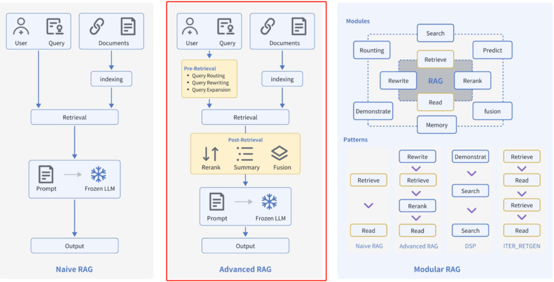 Advanced RAG重点聚焦在检索增强,即优化Retrieval阶段。增加了Pre-Retrieval预检索和Post-Retrieval后检索阶段,同时对检索本身也有优化。