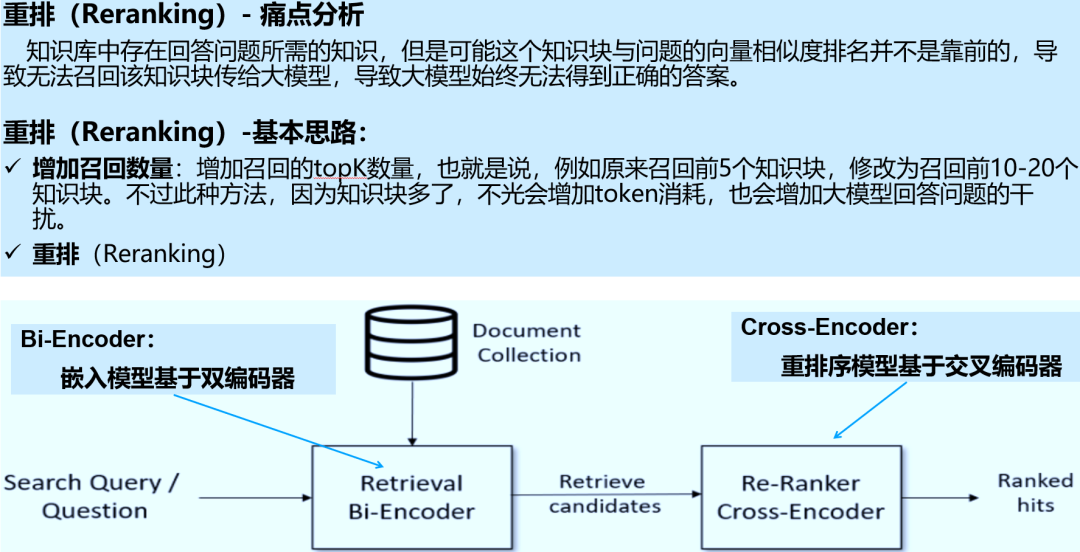 | 4. 错过排名靠前的文档 (Missed Top Ranked) | 知识块存在但向量相似度排名靠后,导致无法召回。 | 1. 增加召回数量:提高 TopK 召回阈值(如从 3 增加到 5)。 2. 重排 (Reranking):利用 Reranker 重新评估候选块的相关性。 |