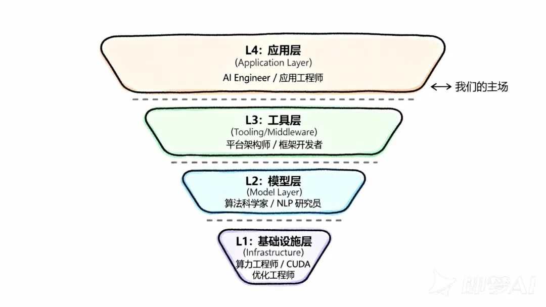 在 AI 的四层金字塔(基础设施层、模型层、工具层、应用层)里,我们不需要去 L1 做显卡,也不需要去 L2 卷模型训练(那是留给 OpenAI 博士们的事)。